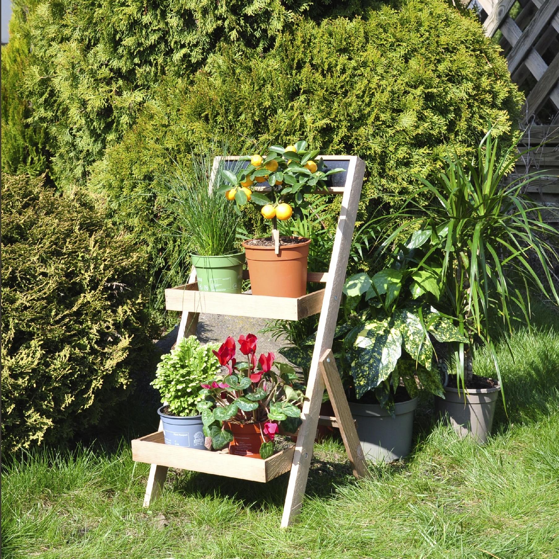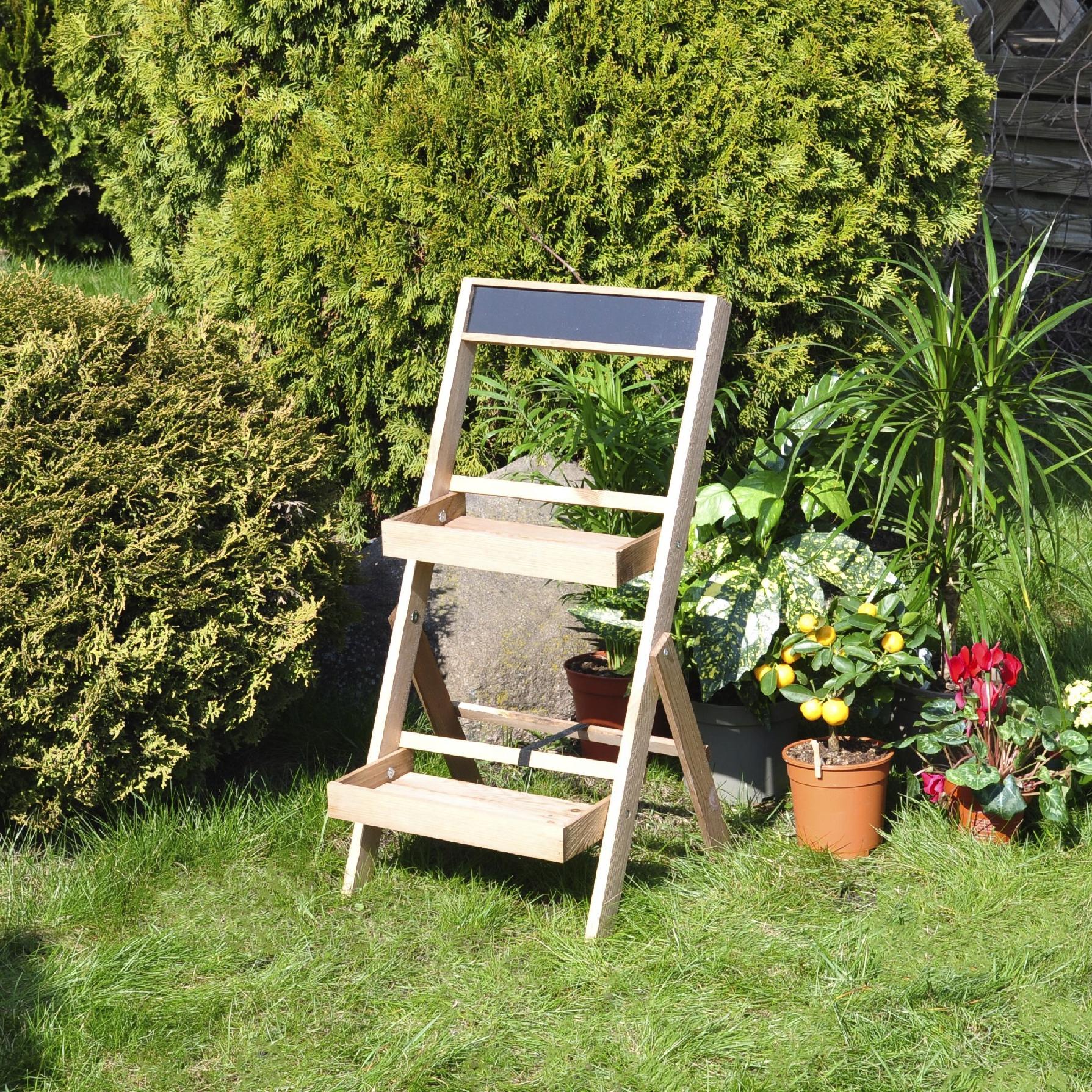 „Składany stojak na elementy wyposażenia każdego ogroduek, czy to będzie dom, sklep lub balkon w krajobrazie. Stojak na kwiaty stworzone jest z substancji materiału - drewna sosnowego i pokryty bejcą na poziomie wody. Stojak zawiera dwie pozycje, do których można dołączyć kilka doniczek z roślinami. Dołączone, czarne urządzenie na górze umożliwia pisanie kredą. Stojak może być używany do uprawy roślin, roślin lub rozsady. Dla użytkownika, stojak jest już zmontowany, wystarczy tylko rozłożyć nóżki. Kompaktowa składana konstrukcja jest stworzona dla roślin sezonowych - w postaci złożonej z bardzo małego miejsca. W formie utworzonej odległość między nóżkami wynosi 30 cm, a rozmiar roboczy do 30x17 cm.