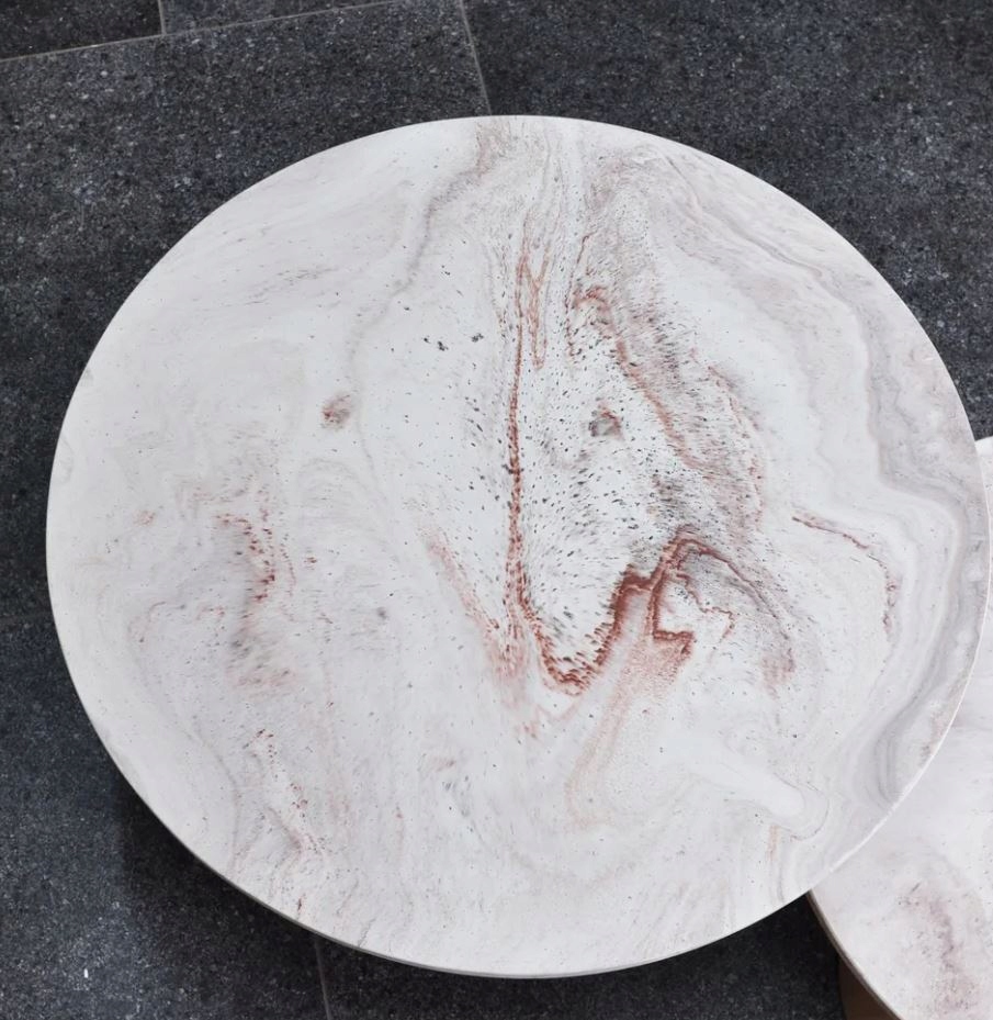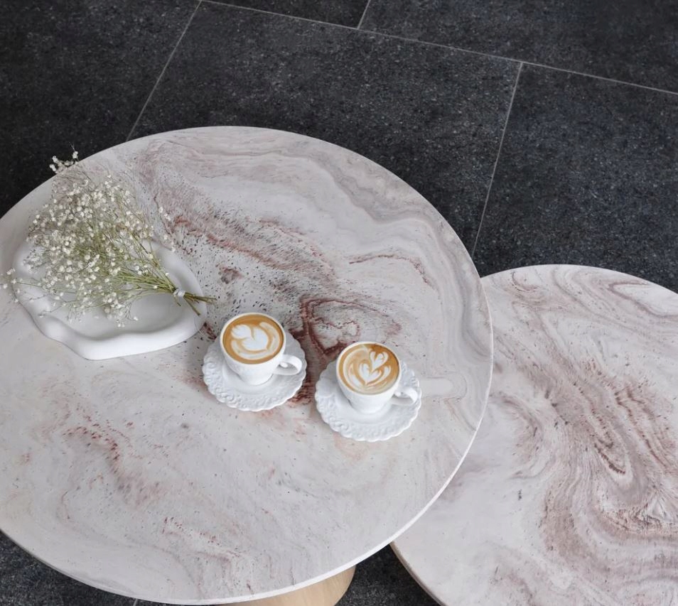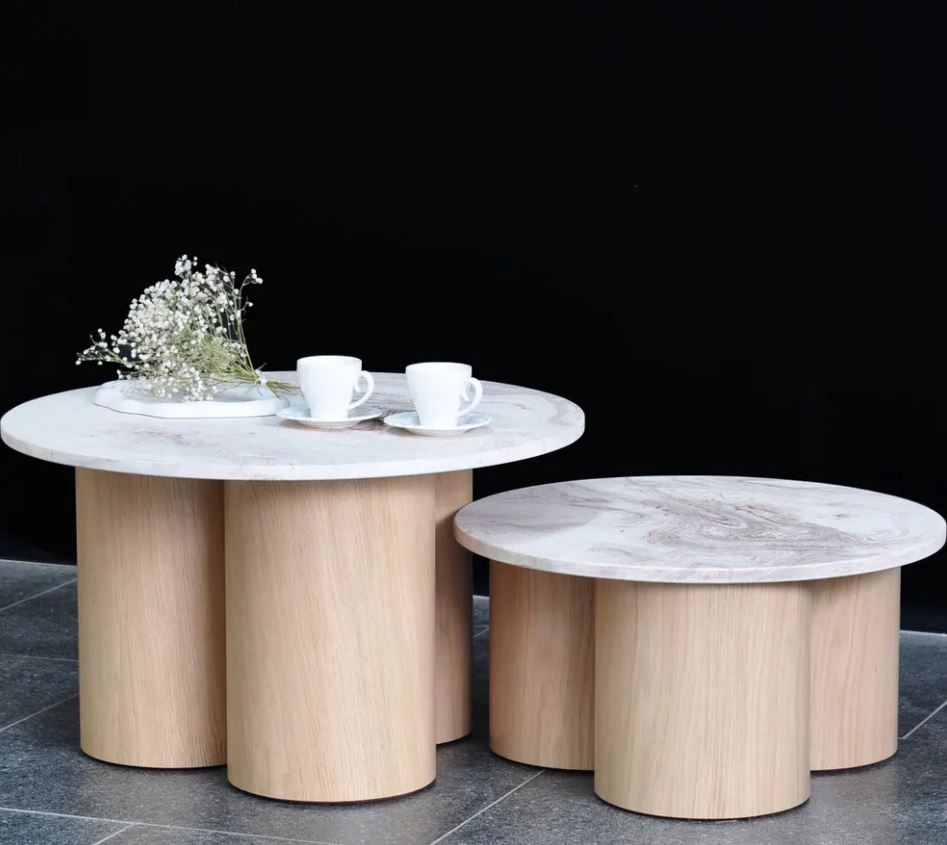 Podstawa kawowego jest wykonana z kamienia mineralnego o abstrakcyjnym wzorze. Blat posiada własną, niepowtarzalną fakturę i kolorystykę, dzięki czemu podwójny stolik kawowy jest naprawdę wyjątkowym dziełem sztuki.