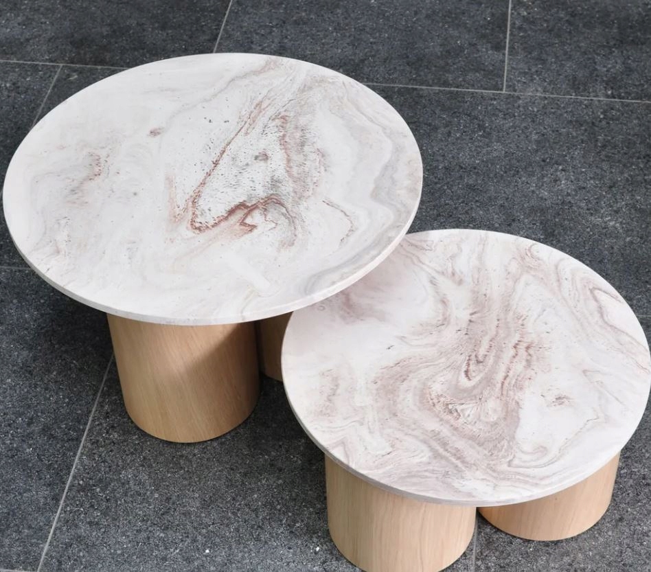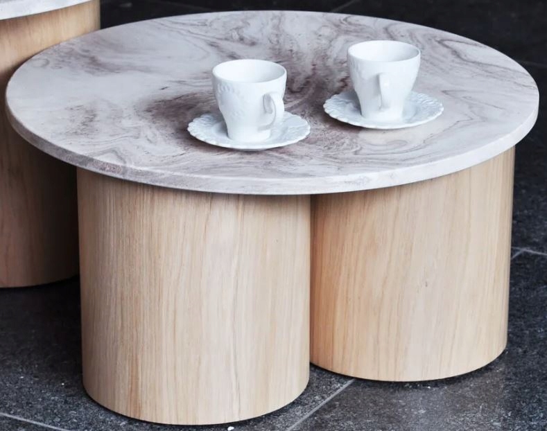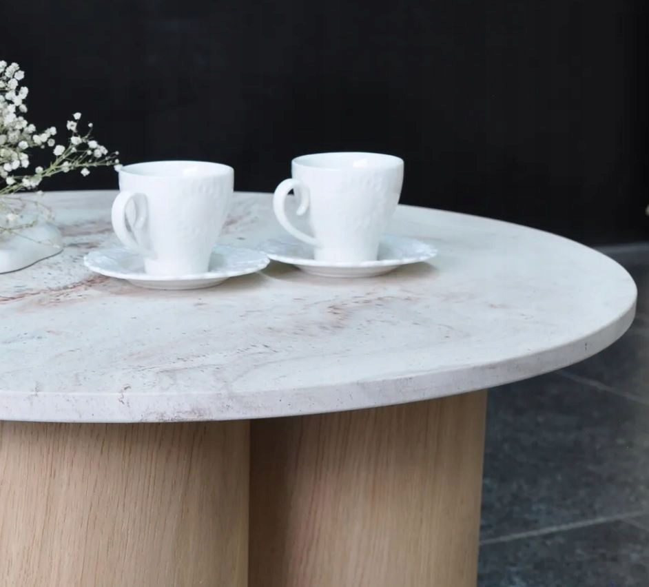 Podstawa kawowego jest wykonana z kamienia mineralnego o abstrakcyjnym wzorze. Blat posiada własną, niepowtarzalną fakturę i kolorystykę, dzięki czemu podwójny stolik kawowy jest naprawdę wyjątkowym dziełem sztuki.