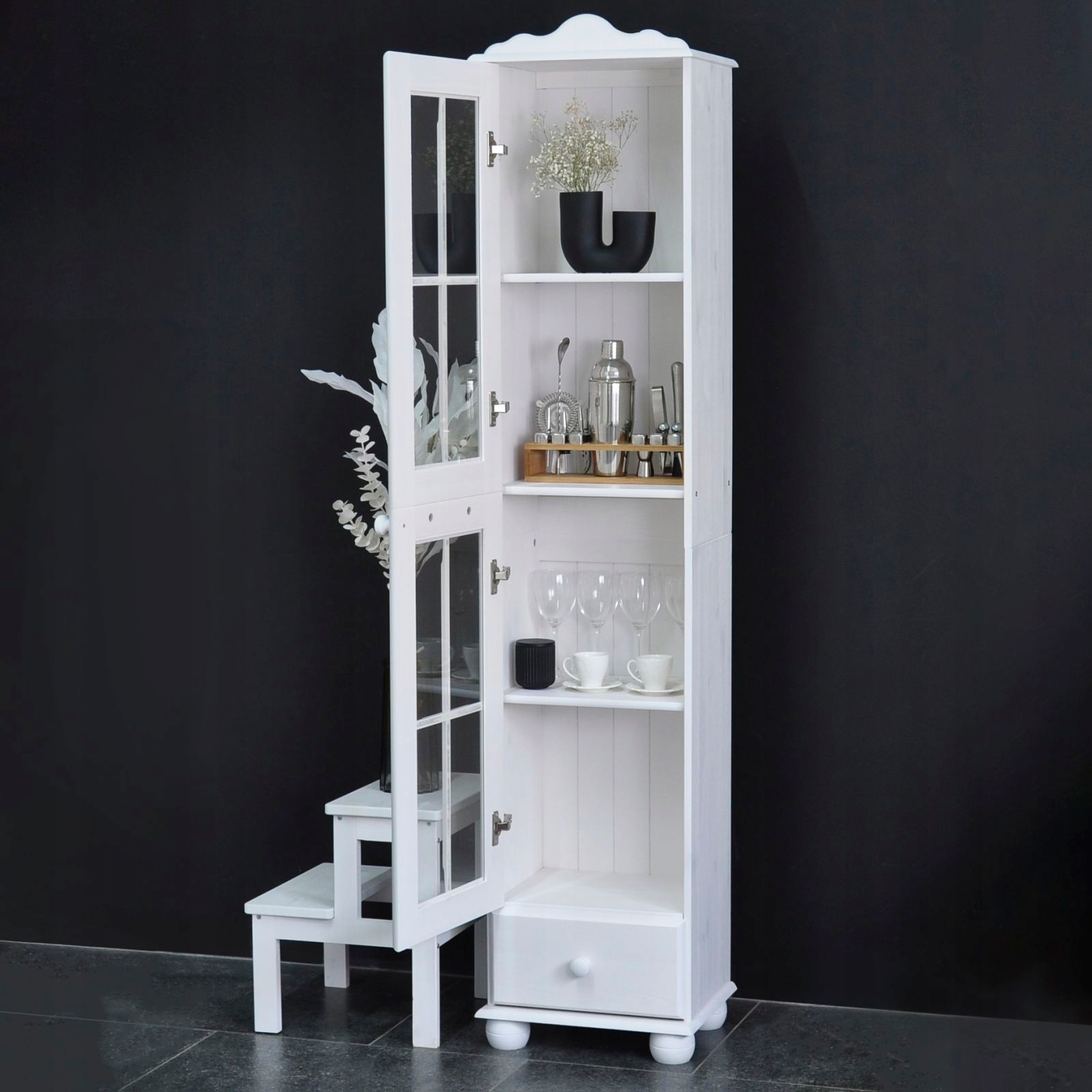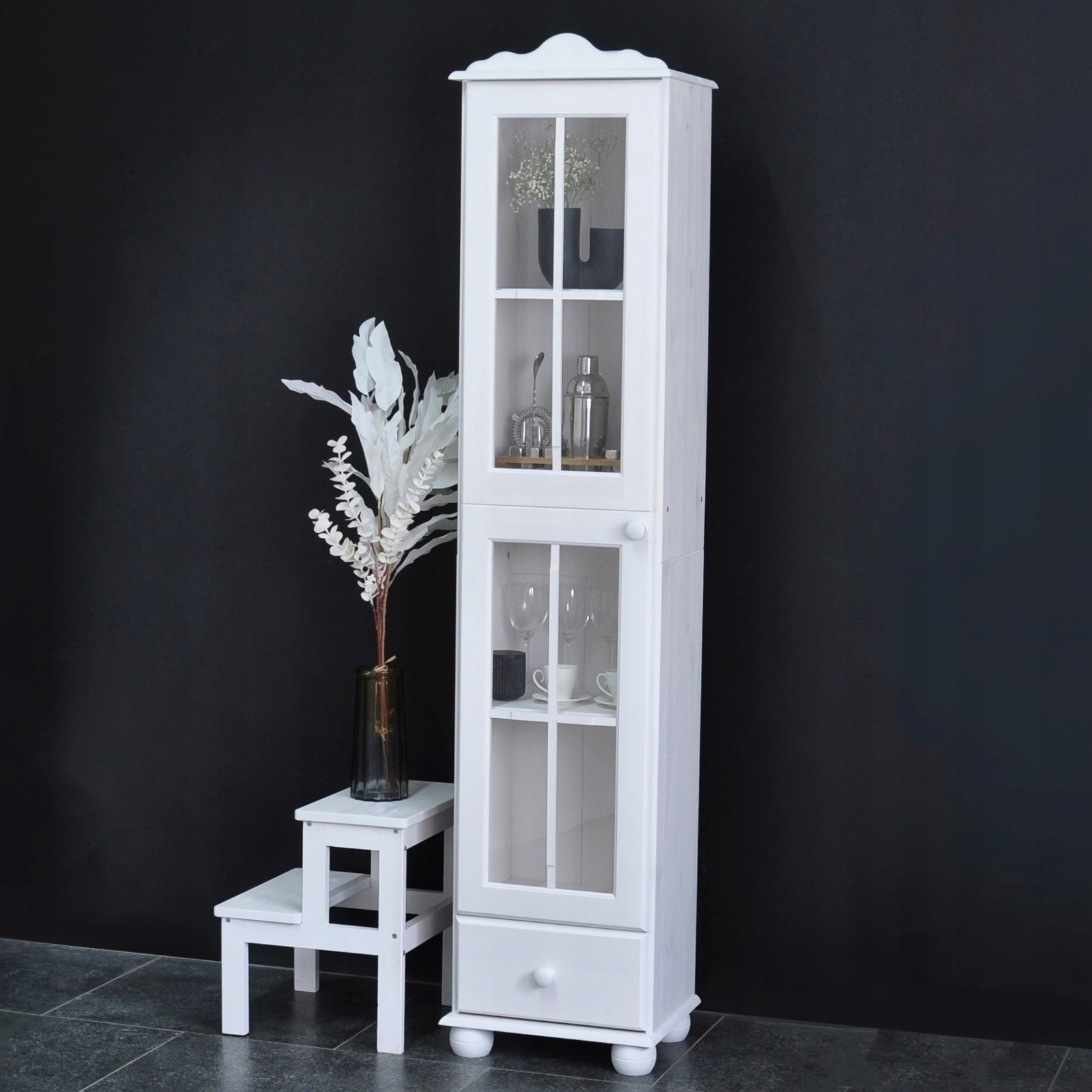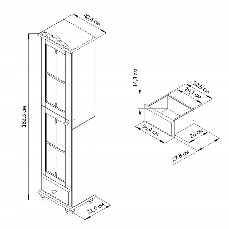 Szafka z witryną jest wykonana z drzewa sosnowego.