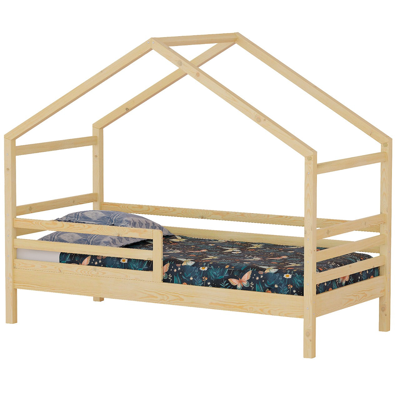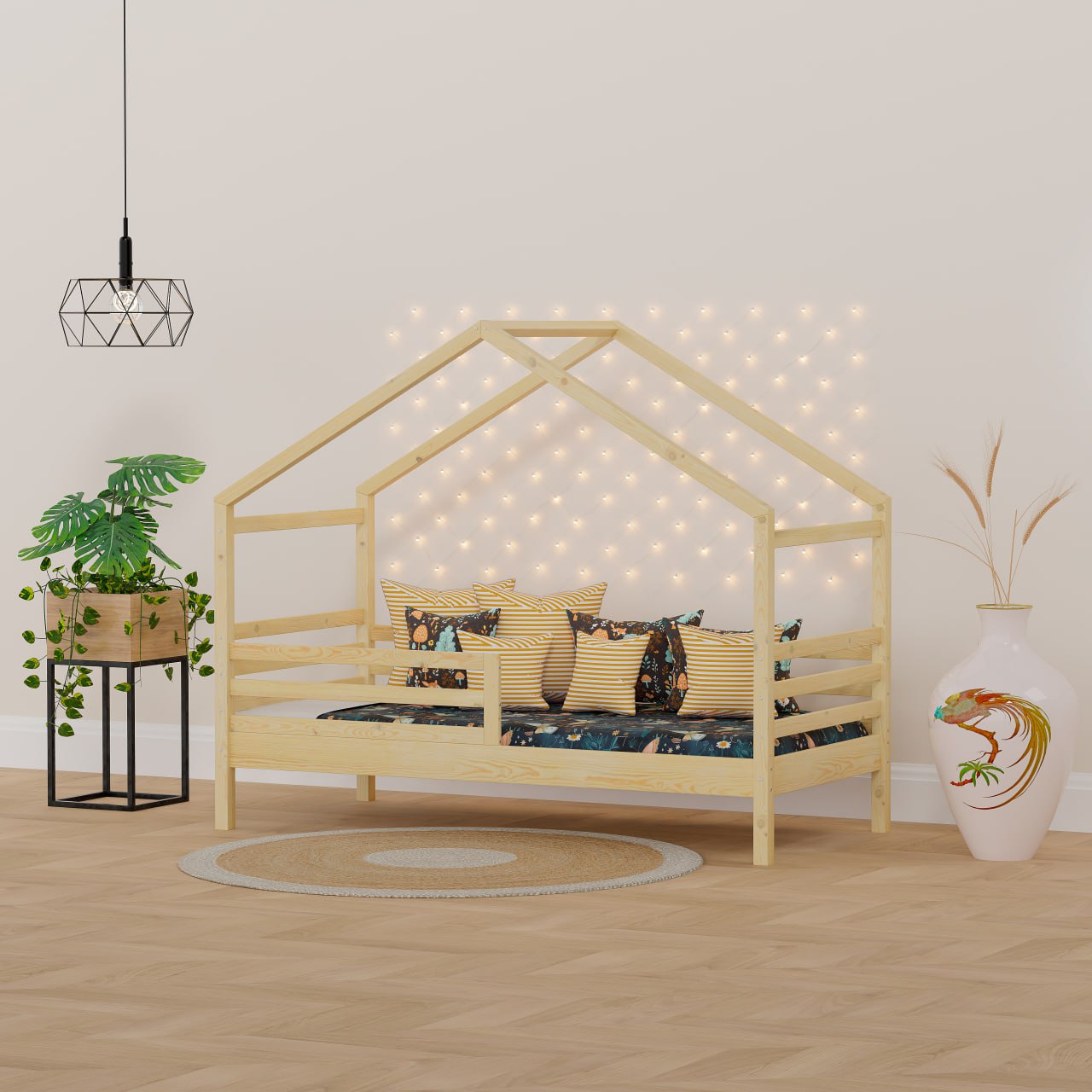 Babybett Hausnische im skandinavischen Stil mit natürlicher Beschichtung, ohne Veredelung. Das Bett aus massivem Kiefernholz schafft eine gemütliche, kreative Atmosphäre im Kinderzimmer. Eine Besonderheit eines Kinderbettes ist das Vorhandensein von Stoßstangen, die das Baby im Schlaf vor dem Herausfallen aus dem Bett schützen. Das Bett verfügt über 4 Sicherheitsgitter sowie einen massiven Kiefernboden mit den Maßen 90x200 cm. Sie können zusätzlich ein Vordach am Kinderbetthaus anbringen, es mit Beleuchtung ausstatten und nach Belieben dekorieren. Aufgrund seines Designs ist das Bett langlebig, knarrt nicht und die Größe des Schlafplatzes macht es auch einem Erwachsenen leicht standzuhalten. Das Bett besteht aus natürlichem massivem Kiefernholz, es riecht nicht nach Farbe, sondern erfüllt den Raum mit einem subtilen und angenehmen Aroma von Nadelholz. Im Produktionsprozess wurden nur hochwertige sichere Materialien und Beschichtungen verwendet. Die maximal zulässige Belastung von 100 kg pro Bett ermöglicht die Verwendung als Kinder- und Jugendbett sowie als Einzelbett für Erwachsene. Ein 102,2 cm langes und 29,6 cm hohes Sicherheitsgitter schützt den Schläfer zuverlässig vor versehentlichen Verletzungen. Gesamtabmessungen des Bettes - (BxHxT): 97x170x203,4 cm, Beinquerschnitt 5x5 cm, Seitenkönigshöhe 33 cm, Abstand vom Boden bis zur Unterseite des Seitenkönigs 21 cm. Dieses Modell ist in drei Ausführungen erhältlich - ohne Veredelung (natur), in Naturlack oder mit weißem Wachs beschichtet. Ein Kinderbetthaus mit Seiten ist aufgrund eines Zubehörsatzes für die Montage, der mit dem Bett geliefert wird, einfach zu montieren. Das Set enthält eine detaillierte bebilderte Anleitung, mit der Sie das Bett einfach und schnell zusammenbauen können. Das Produkt ist mit einem Matratzenbezug ausgestattet (die Matratze ist nicht im Lieferumfang enthalten, sie wird separat erworben). Die empfohlene Matratzengröße beträgt 90x200, max. die Höhe der Matratze beträgt bis zu 20 cm. Es ist möglich, das Sideboard bei der Montage rechts und links zu installieren. Die Seite kann bei der Montage weggelassen werden.
